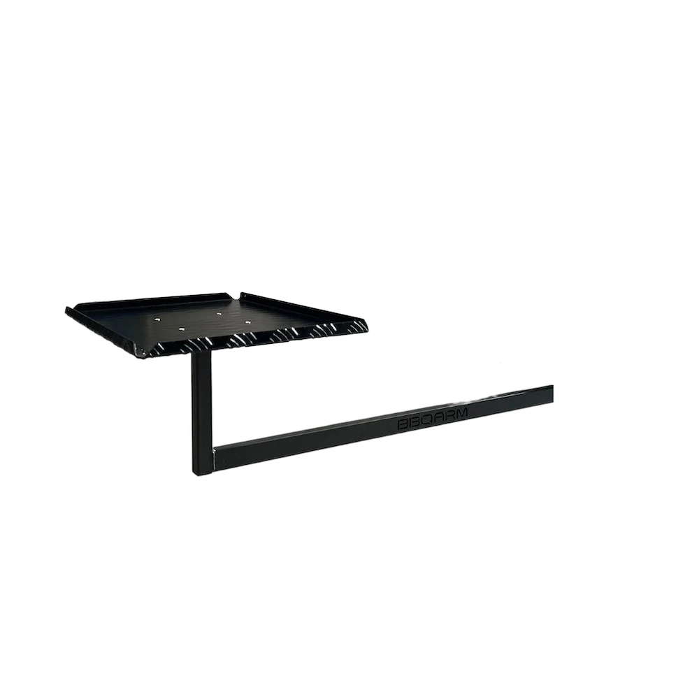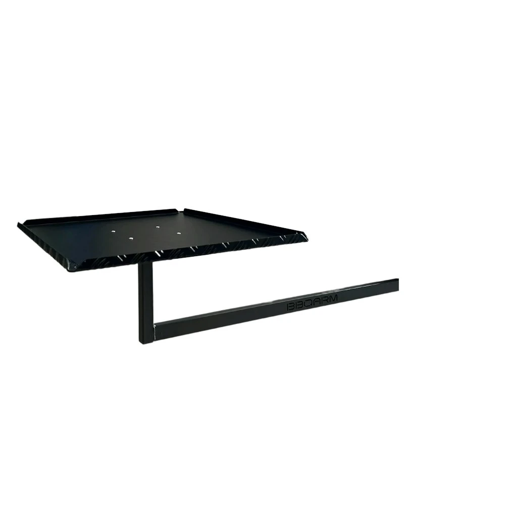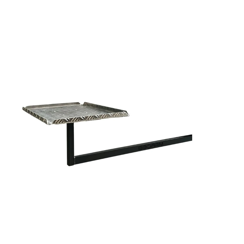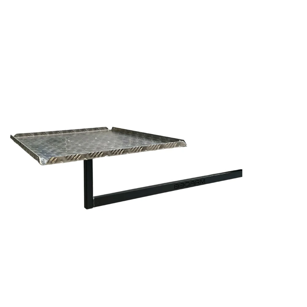 The new Under Chassis Mounted BBQARM consists of 3 parts listed below: 1. Under Chassis Mount (UCM) The new Under Chassis Mount (UCM) is specifically designed to mount up under your chassis. The UCM is made from heavy duty 6mm steel and powder-coated with a highly durable, Dulux “ProTex Monument” 2. Under Arm The Under Arm is made from heavy duty galvanised tube and is powder-coated with the same highly durable, Dulux “ProTex Monument”. This Under Arm is designed to pull against the chassis enabling the kit to be mounted without bolting or welding. 3. Tray/Table Top Made from 2.5mm aluminium checker plate with upturned edges in your choice of black powder-coat or plain. Trays are available in two different sizes: Regular 560mm x 360mm (suits Weber Baby Q & Q2000) Large 700mm x 500mm (suits Ziggy and larger portable BBQs)
