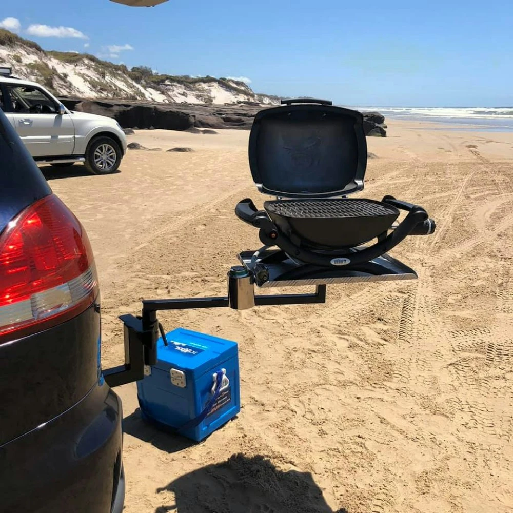 The BBQARM kit includes: 1. ARM – black powder-coated galvanised steel available in 2 lengths: * 650mm * 850mm 2. TRAY – chequer-plate aluminium with upturned edges * regular 560mm x 360mm (suits Weber Baby Q & Q2000) * large 700mm x 500mm (suits Ziggy and most other portable barbecues) * choose plain chequerplate or black powdercoat 3. VEHICLE TOW-HITCH MOUNT – designed to fit 50mm tow-hitch receiver