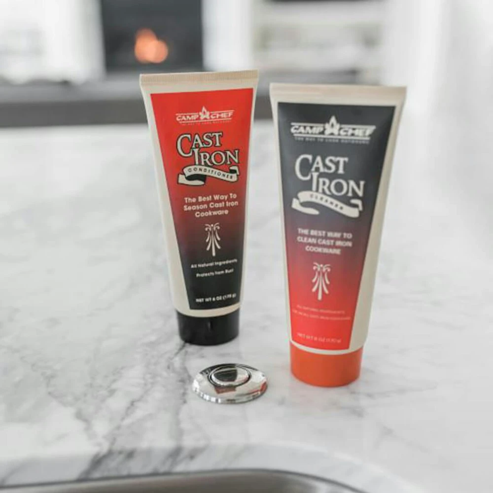 This special blend of all-natural oils and cleaning agents breakdown sugars and other food particles. The natural oils will not damage the finish of your cast iron cookware, it’s safe to use on all seasoned and enamel pieces. For best results, follow up with some Camp Chef Cast Iron Conditioner to protect your iron with a fresh layer of seasoning.