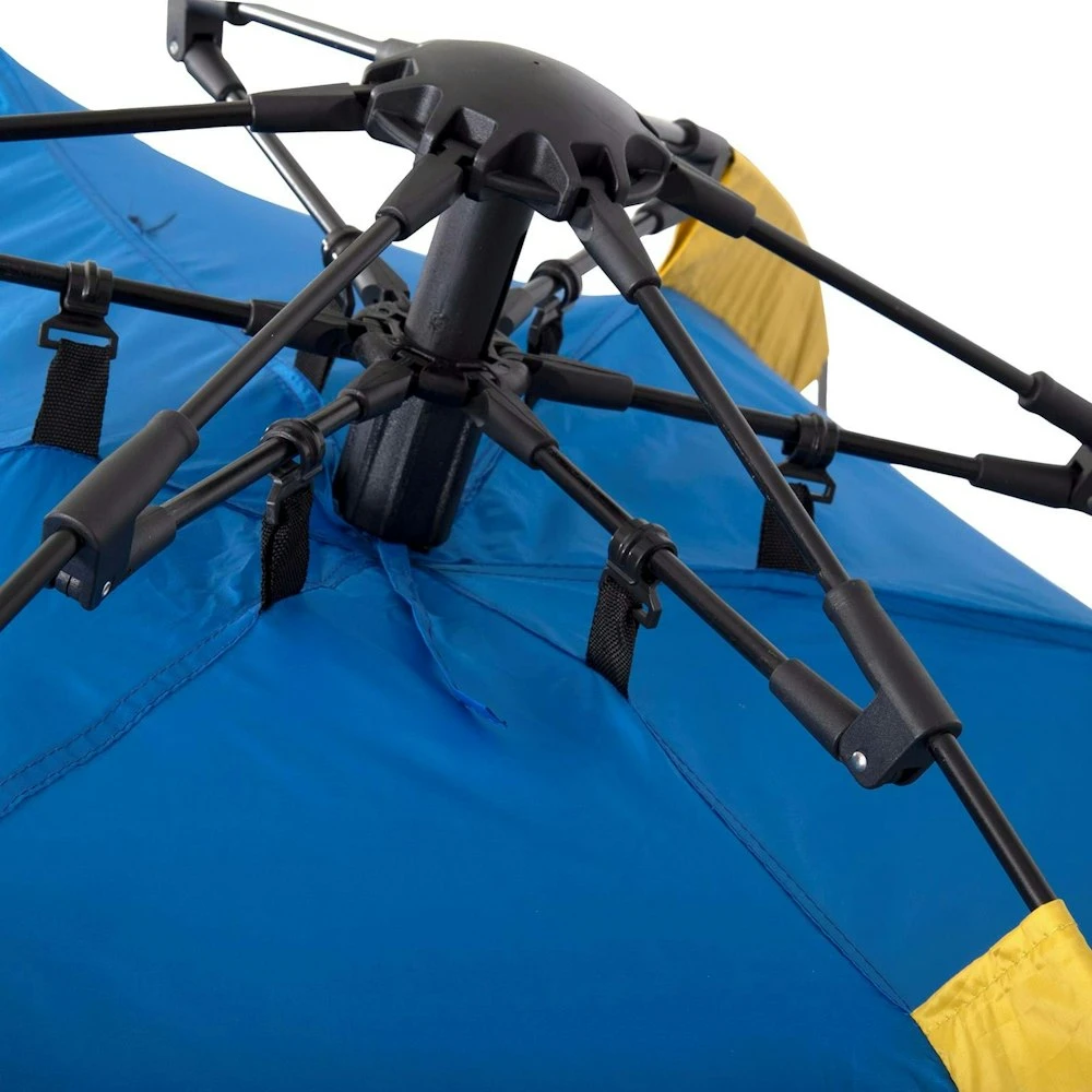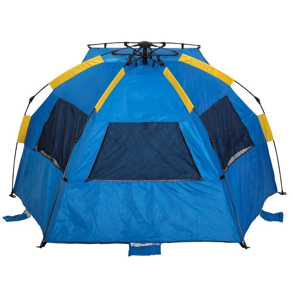 Protect yourself from the sun this summer with the Bondi Sunshelter. The quick up frame features fibreglass poles and assembles in an instant. This shelter has a UPF50+ protection factor to shield you from UV rays, a built-in floor for comfort, and windows for extra ventilation. It has sand pockets for extra stability and can be secured down with the included pegs.