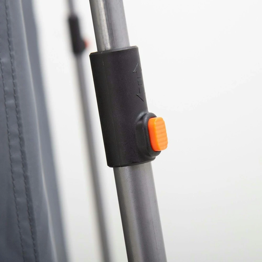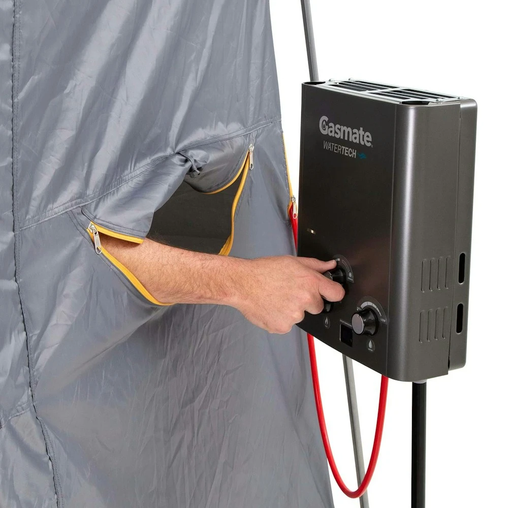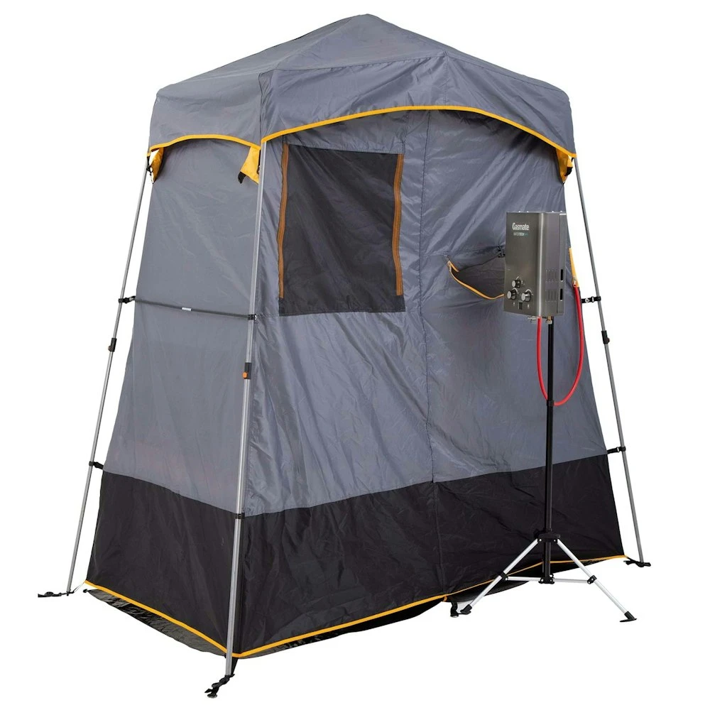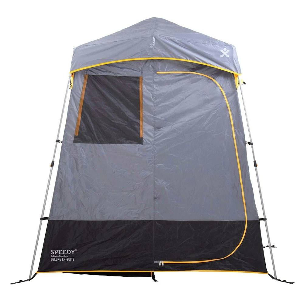 Description: Enjoy camping in comfort and style and shower and change in comfort and privacy with the Speedy Deluxe En-Suite. This deluxe ensuite is constructed from 210T polyester with a silver coating for ultimate privacy. It also features an instant up non-corrosive 9.5mm powder-coated steel frame for a simple set-up. There is a built-in divider between the two rooms for separation, windows for ventilation, and an integrated drainage floor in the shower area with a removable floor in the change room. Keep your essential toiletries in the internal storage pockets and caddies, and your towels ready for use on the internal and external rails. Hang your hot water unit (purchased seperatley) just outside the ensuite, thanks to the shower hose inlets and hanging hooks.