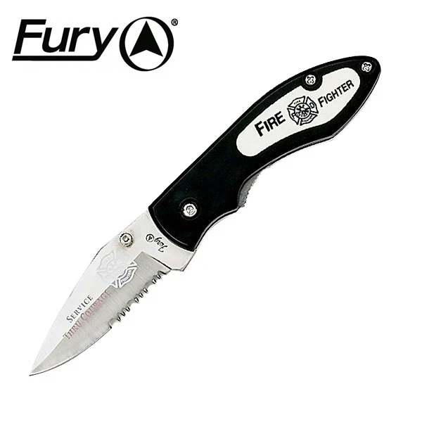 Fury Fire Fighter Pocket Knife is a compact size folding knife with the fire fighter symbol on both the blade and handle and the words ‘Service Thru Courage’ written on the blade. Practical and affordable, this stainless steel half serrated blade with pocket clip would make an amazing gift for someone with a Fire fighting background or interest.