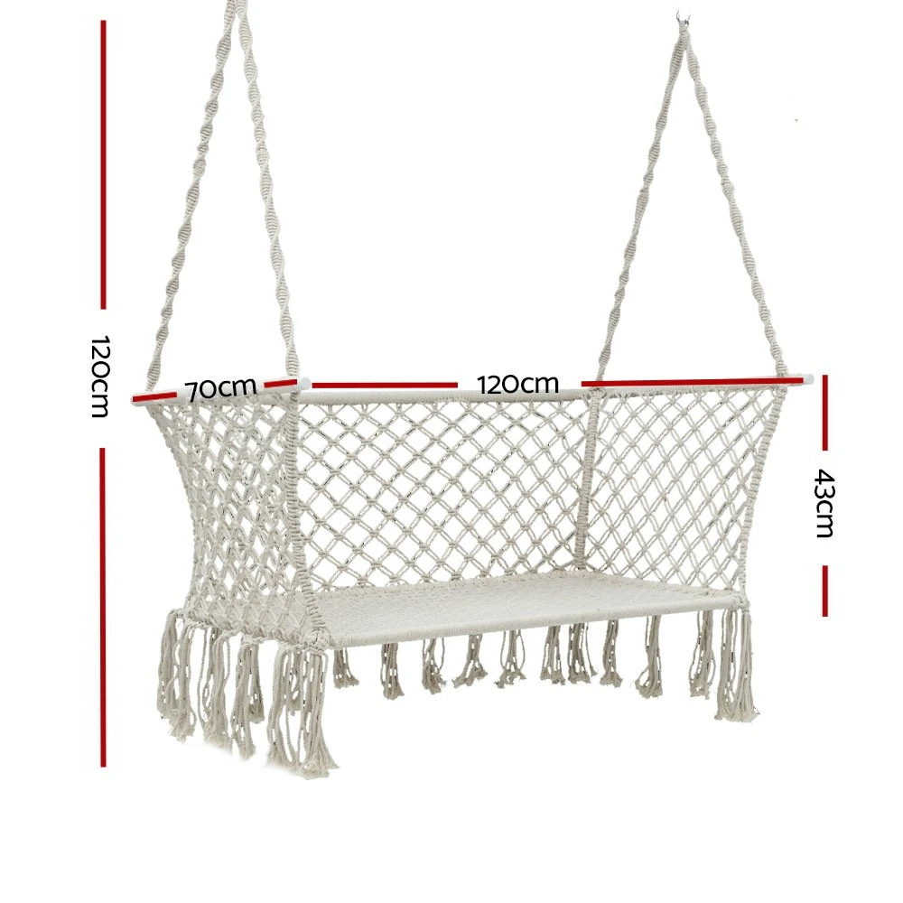 Lazy days and chill out moments. Somehow, they seemed to go better in our beautifully-crafted handmade Gardeon Hammock Chair. Designed to cup you comfortably, our hammock chair is extremely relaxing to sit on with ample support for your back and arms. Built of a sturdy structure wrapped in a mix of polyester and cotton fabric, and adorned with lovely handcrafted tassels, our 2-seater hammock chair has all the right vibes of days spent enjoying your favourite past times suspended in mid-air with nary a care in the world. String it over a tree, mount it at a verandah or install it inside the house, the hammock chair hangs well in any place for a very unique décor. Decorations and accessories (like pillows) are not included Features: Fully handmade hammock 2-seater Lovely tassels Firm structure Durable and soft fabric Suitable for both indoor and outdoor use Specifications: Brand: Gardeon Material: 65% Cotton, 35% Polyester Weight capacity: 200kg Overall size: 120cm x 70cm x 120cm Colour: Cream Product Contents: Gardeon Hammock Chair x 1