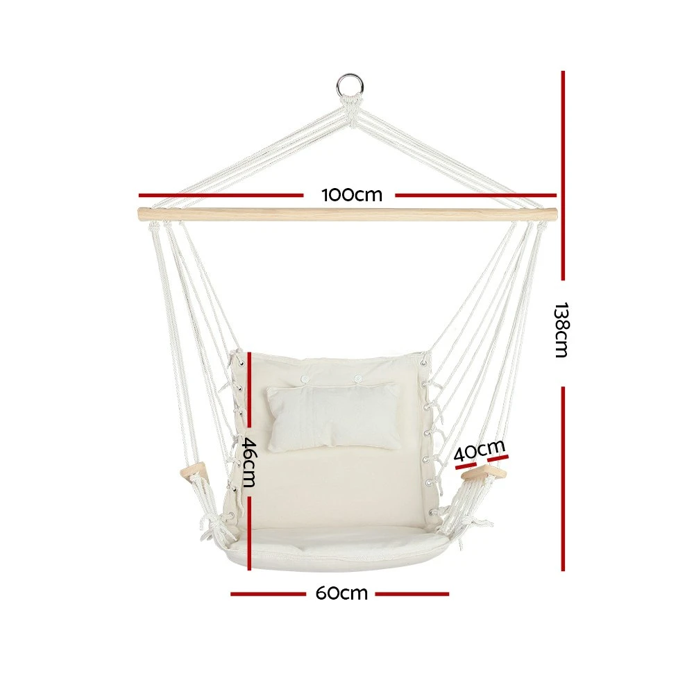 Comfy Hammock Chair We want it to be a long lasting hammock at your home. Made of solid timber rail with quality polyester cotton, you can hang it at your backyard as a chilling spot for reading books or taKing a nap. Its durable strings can hold up to 120kg that would suit almost everyone – anyone can chill any time. Comes with a soft pillow and padded seat, it is a nice comfy spot to chill at with a book or just listening to songs. Designed with armrests that lets you rest on whenever you like. Very simple installation, you can take it with you to a barbecue or on a vacation. It can be attached to trees, ceilings or pergola beams. Note: Only hand wash the pillow by gentle pressing. Do not put the pillow in a washing machine. It will damage the filling. Features * Can be used indoors or outdoors * Removable Pillow * Thick Foam Padding * Wooden Armrests * Durable & Soft Touch Fabric * Single Attachment point * Smooth Finished natural Timber * Durable Long Lasting Rope Specifications * Material: 65% Cotton, 35% Polyester * Overall size: 100 x 60 x 138cm * Timber rail size: 100 x 3.5 x 3.5cm * Arm rest length: 40cm * Seat size: 60 x 40 x 46cm * Pillow size: 40 x 24cm * Weight capacity: 120kg * Colour: Cream Package Contents 1 x Hammock Chair w/ Armrest 1 x Detachable Pillow