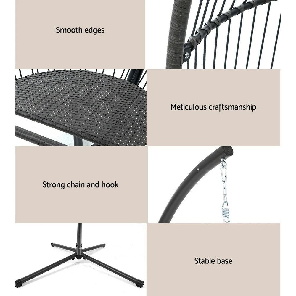 Otherwise known as the hanging egg chair, the Gardeon Hanging Pod Chair is the epitome of ultimate relaxation. Featuring 100% hand-woven UV-resistant wicker, the pod is beautifully handcrafted to give it a cool, exotic appeal that will suit any balcony, poolside, or indoor living space. It has ample space for relaxation with a weight capacity of up to 150kg. You can really take in the views as it rotates 360, or you can tie the chair to the pole with the included rope if you prefer more stability. The powder-coated steel frame ensures corrosion is never an issue. Best of all, the soft, inviting cushion offers plush comfort for day dreamers and leisure seekers alike. Hang cool people! Get your Gardeon Hanging Pod Chair just in time for summer! Features Exotic appeal Durable anti-rust frame 100% handcrafted All-weather and UV-resistant Soft and removable cushion Anti-fade Easy assembly Fixed rope included Specifications: Material: Resin wicker Frame: Powder-coated steel Frame size: 116cm x 105cm x 200cm Pod size: 80cm x 60cm x 110cm Cushion material: 100% Polyester Weight capacity: 150kg Colour: Grey Package Content Pod Standx 1 Large Cushion x 1 Pillow x 1 Chain x 1 Hook x 1 Fixed rope x 1 User Manual x 1