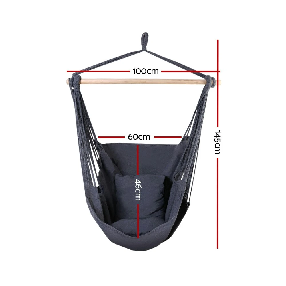 Love hanging around the patio? Or the garden? Or the great outdoors? Our Hanging Hammock Chair will get you comfortable in no time at all. Made from quality polyester cotton with a solid timber rail, our Hammock Chair can rope in a maximum of 120kg in weight. Itinch easy to install with only one anchoring point and is absolutely safe and strong. With three great models in an assortment of colours to choose from, the Hammock Chair can even be taken to vacations or anywhere that you fancy. So wait no more. Get your Hammock Chair today and have a swinging time chilling out. Note: Only hand wash the pillow by gentle pressing. Do not put in a washing machine. It will damage the filling.” Features: Durable and soft-touch polyester cotton blend fabric Smooth finishing natural timber rail Easy installation with one single attachment point Comes with 2 colour-matching cushions Best way to relax or read a book Suitable for both indoor & outdoor application Specifications: Material: 65% Cotton 35% Polyester Overall size: 100x45x145cm Timber rail size: 100×3.5×3.5cm Pillow size: 40x40cm Weight capacity: 120kg Colour: Grey Product Contents: (1) Hammock Chair x1 (2) Cushions x2