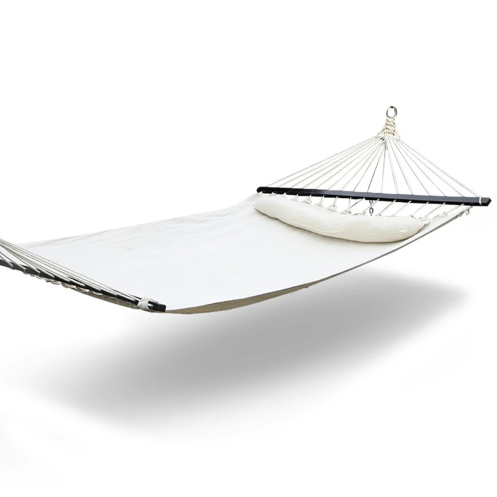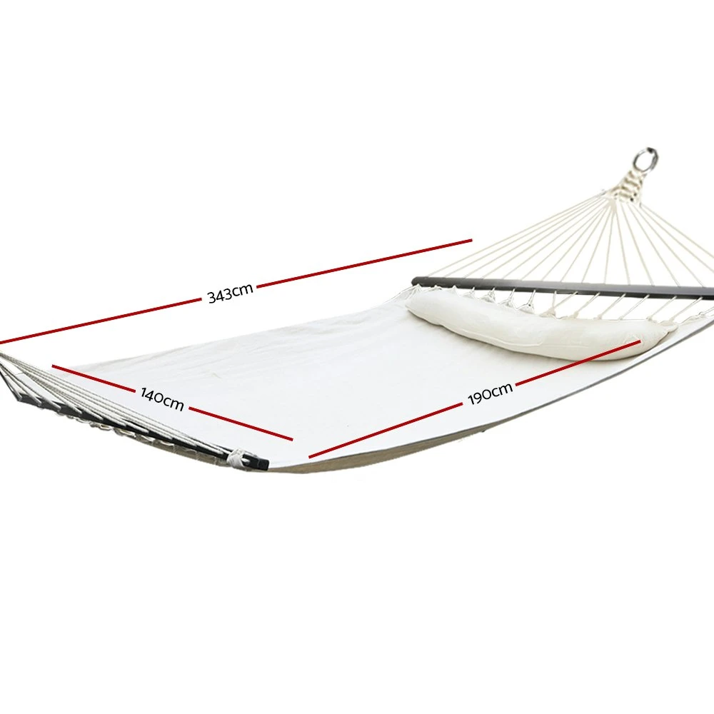 Love hanging around the patio? Or the garden? Or indoors? Our Gardeon 2-person Hammock will get you and your favourite person comfortable in no time at all. Made from a quality polyester and cotton blend fabric, our 2-person hammock can rope in a maximum of 150kg in weight. The smooth timber rails also helped to give a good balance to the hammock as well as some stylish touches. A detachable soft pillow is also included. Not least, it is easy to install with a hanging kit included for a hassle-free set-up. Features: Durable polyester cotton blend fabric Detachable soft pillow Hanging kit included Smooth timber rails Indoor or outdoor use Specifications: Material: 65% Cotton, 35% Polyester Weight capacity: 150kg Overall size: 343cm(L) X 140cm(W) Hammock bed size: 190cm X 140cm Product Contents: Hammock bed x 1 Chains x 2 Hooks x 2