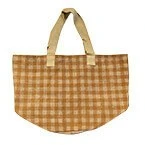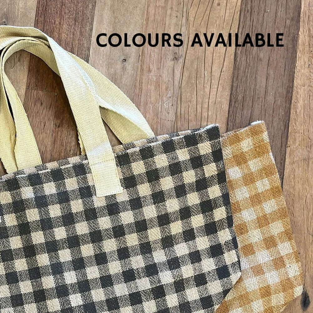 THIS FUNKY REUSABLE OCHRE GINGHAM JUTE SHOPPING BAG HAS BEEN MADE TO CREATE AN AFFORDABLE ALTERNATIVE TO THE SINGLE-USE PLASTIC BAGS THAT ARE HARMING OUR PLANET