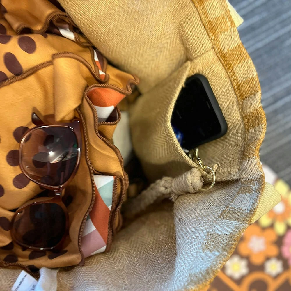 Wide and roomy, this tote is made from a jute/cotton mix and comes in a fashionable yet timeless gingham pattern. Its long soft cotton straps make it comfortable and easy to carry over your shoulder.