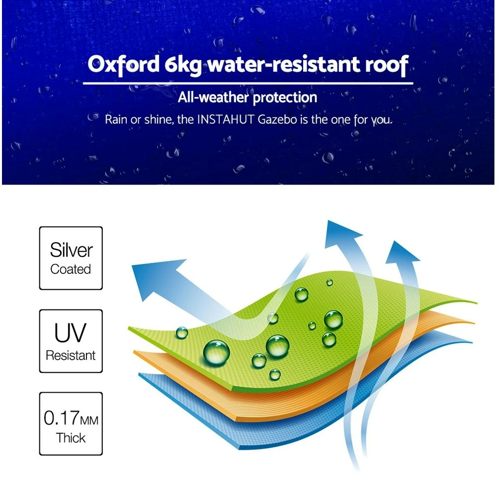 With a wide roof coverage of 300cm by 600cm, the exceptional 6kg cover is made of durable silver-coated Oxford fabric thatÂs both UV and water resistant. No more worries about being too hot or too wet, you can get your event going with total peace of mind from the elements. Giving you ample dry cover from rain and adequate protection from UV radiation.