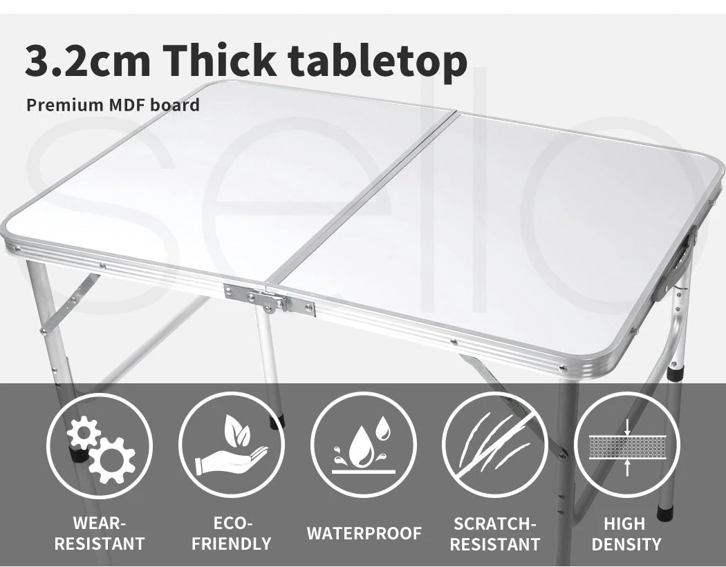 Our Foldable Camping Table is an ideal solution for an outdoor family picnic or camping trip with your loved ones. Designed with convenience in mind eases all those troubles of outdoor picnic. Very simplistic to setup with its ultimate compact design. Exceptionally easy to carry around due to its minimal weight. A special handle is provided at the side of the main board conveniently carry it with ease. A travel friendly product. Designed to be lightweight and portable easy to carry and easy to handle. Easy to adjust its height for convenient use. Fold it away foldable design for an easy wrap up after use. Built with quality in mind strong and sturdy aluminium frame. Highly resistant towards rust water and chemicals. High strength MDF board can handle up to 30kg of weight. Hinged table support provides enhanced stability. Rounded corners for risk-free use. Pack it up within 90 seconds. Equipped with three height adjustments choose a height you prefer. Provided with anti-slip bottom to prevent accidental slippage. A perfect product for camping outdoor family picnic or for any home use. Key features Lightweight and portable Two height adjustment Foldable design with carry handle Sturdy aluminium construction Smooth MDF tabletop Corrosion resistance No assemble required SPECIFICATION: Brand: Levede Frame material: aluminium Tabletop: MDF board Weight capacity: 30kg Adjustable height: 40cm / 70cm Unfold dimension: 90cm x 60cm x 70cm (L x W x H) Folded dimension: 60cm x 45cm x 6.5cm (L x W x H) Colour: Silver PACKAGE CONTENT: 1x Levede Foldable Camping Table
