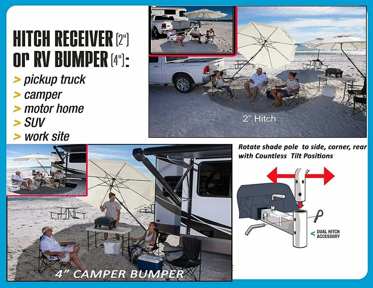 ALL DAY SHADE | Blocks the sun 100% of the day, offers 5 tilt positions, strait, plus 22.5 and 45 degree tilt capabilities in either direction; plus easy-to-adjust telescopic pole to further position the length/height of pole/umbrella
