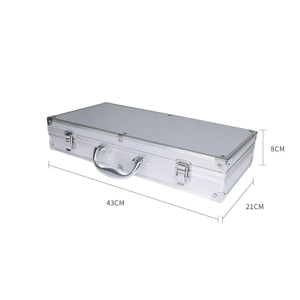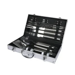 A perfect BBQ needs the perfects tools and you can’t go past these BBQ accessories. Put a few T-bone steaks some onions a few portobello mushrooms and you have a fine meal to impress the harshest critics. Nobody wants to be cooking in a park with friends and they are missing an implement. Your new camping utensils have you covered. Tongs knife spatula skewer. You will be organised for cooking anything. Carry your grilling accessories wherever you need in your aluminium carry case. Take them out to your backyard or on a long road trip. Set up the perfect coal barbeque and cook away. Clean them after each use and they will treat you well. Our stainless-steel tools are known for their durability. The long handles are perfect for keeping you safe when cooking. Keep everything organised and neat. The quick lock button keeps everything nice and protected when you are carrying your grill set. Enjoy the easy to clean grid texture interior for years to come. Key Features 18 piece stainless steel tools Aluminium case Quick lock button Interior grid texture Portable handle Easy to clean Wide application SPECIFICATION: Brand: Moyasu Material: Stainless steel Case: Aluminium Dimensions (case): 43cm x 21cm x 8cm (W x D x H) Colour: Silver PACKAGE CONTENT: 1 x Moyasu Aluminium Case 2 x Moyasu Spice Shaker 1 x Moyasu Spatula 1 x Moyasu Basting Brush 1 x Moyasu Cleaning Brush 1 x Moyasu Tongs 1 x Moyasu Knife 1 x Moyasu Fork 4 x Moyasu Kebab Skewer 6 x Moyasu Corn Cob Holder