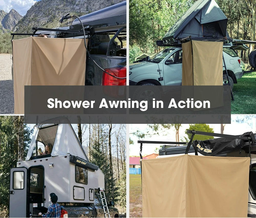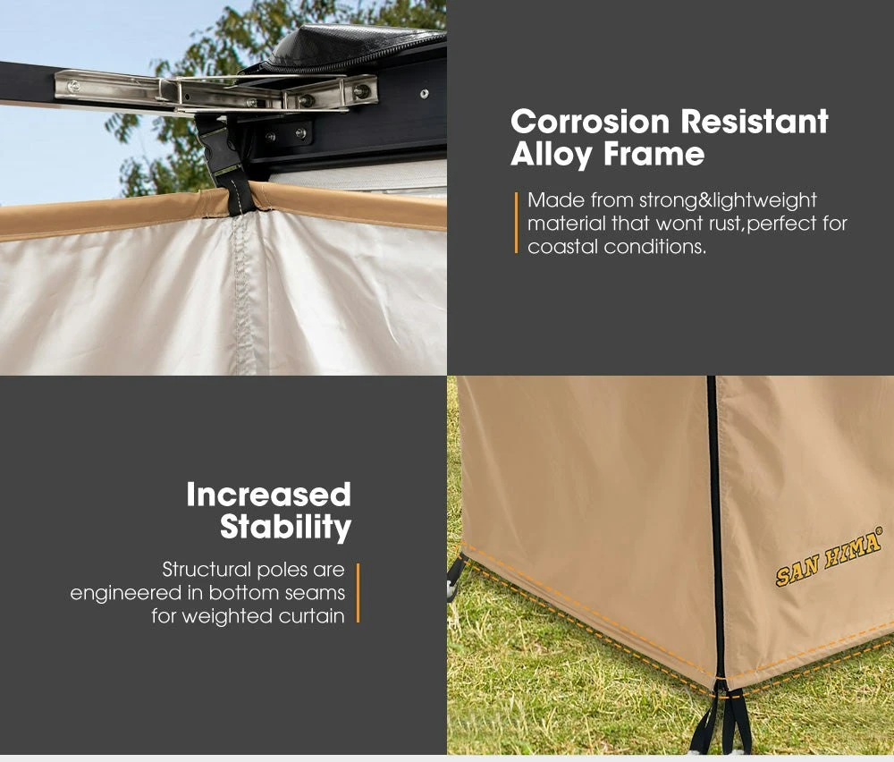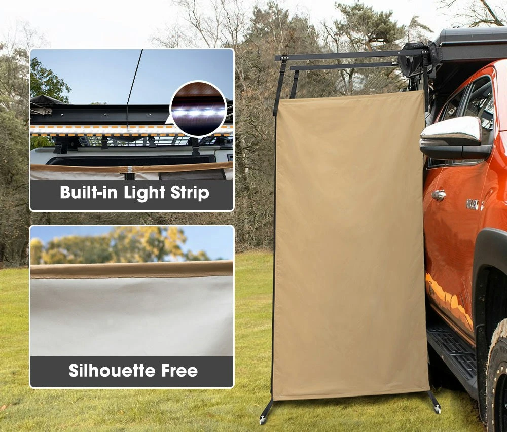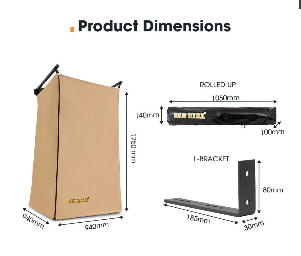 DESCRIPTION Camping shower tents are the perfect solution to hygiene or privacy issues. Shower tents can be used to house your portable shower, as a toilet, or as a dressing room. Simply mounting to the roof rack of your vehicle, this SAN HIMA shower tent guarantees the comfort you didn’t even know was possible in the outdoors.Our car side shower room is made of 420D Ripstop, UV resistant Oxford fabric. And the 6063-grade Aluminium frame is strong and corrosion resistant. The toilet tent can be set up in 30 seconds, and can be tucked away into the 650D UV resistant PVC travel bag when not in use. The instant shower tent comes with a bright LED light strip which will give you more than enough light in the dark. Two pockets are added to hold your toiletries. With the elastic hanging rope, you can hang clothes, towels and other accessories in the awning shower tent. And a shower hook is included for ease of shower installation. The shower tent awning is all you need to elevate your camping experience FEATURES Set up in 30 Seconds: Simply unzip, fold out and peg down your awning shower tent where necessary. Vehicle Mounted: Our camping shower tent simply mounts to the roof rack of your vehicle, which allows easy access to the shower tent. Hassle Free Storage: The shower tent awning can neatly be tucked away into the 650D PVC travel bag, which is UV resistant and 8,000mm waterproof. Heavy Duty Fabric: Our car side tent is made of 420D Ripstop, UV resistant Oxford fabric. Adjustable Hanging Straps: Adjustable hanging straps of the instant shower tent allow you to change the height of your curtain. Increased Stability: Structural poles are engineered in bottom seams for weighted curtain. Built-in Light Strip: The instant shower tent comes with a bright LED light strip which will give you more than enough light. Silhouette Free: The toilet tent features an extra silver lining which eliminates silhouettes. Handy Pockets & Rope: Two convenient pockets are added to hold shower & bathroom items and an elastic hanging rope is added to hang clothes & towels. Included Hose Hook: The camping shower tent features a shower hook for ease of shower installation. SPECIFICATIONS