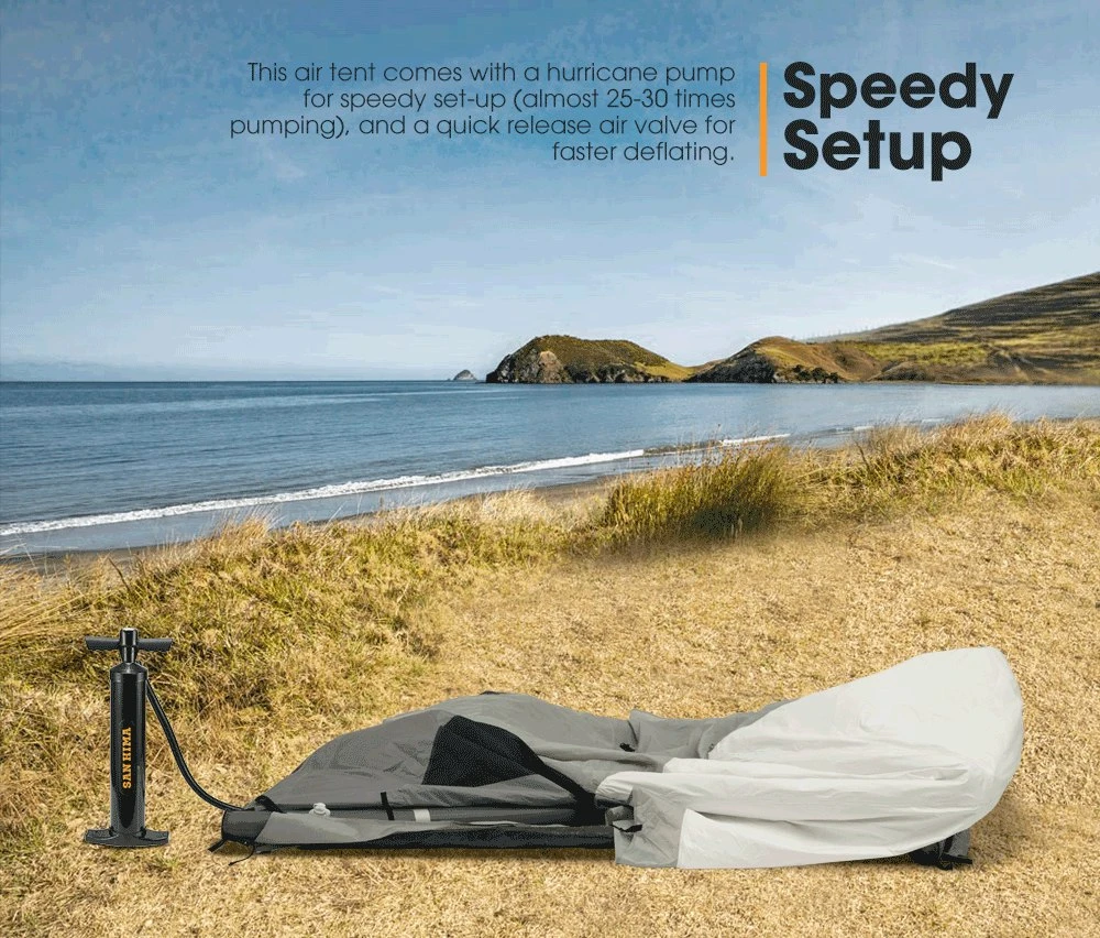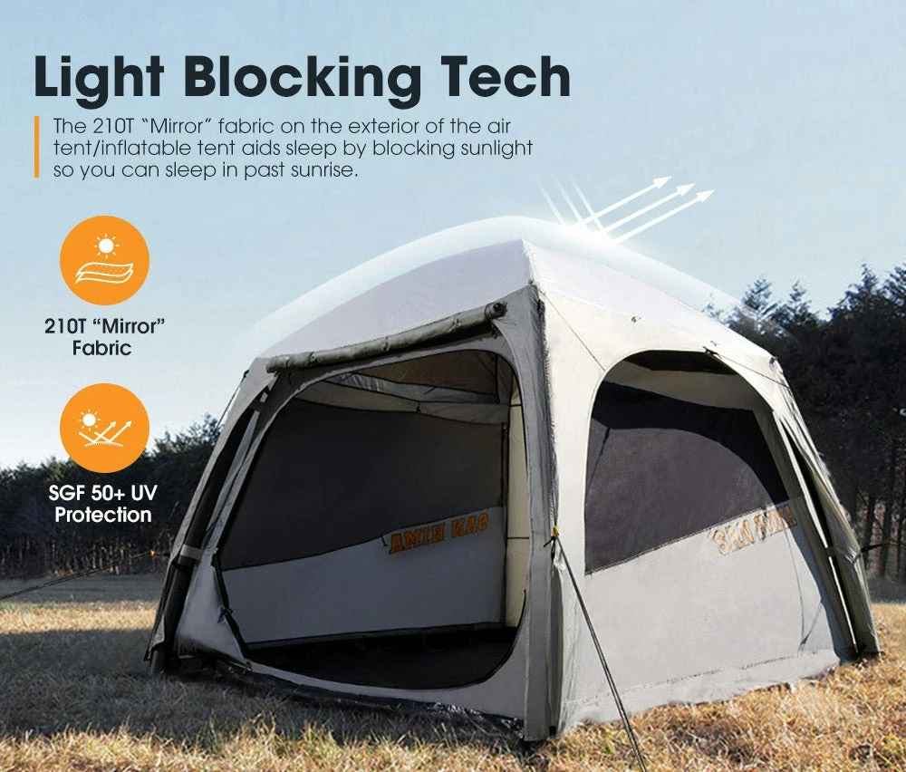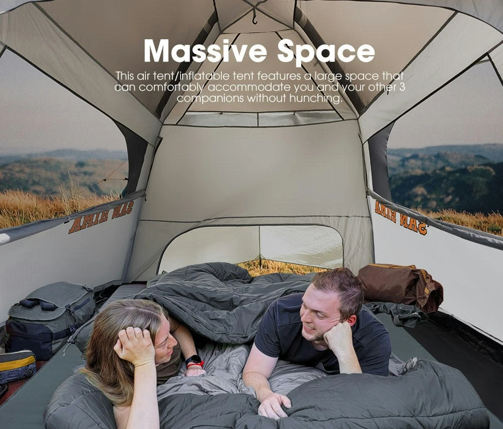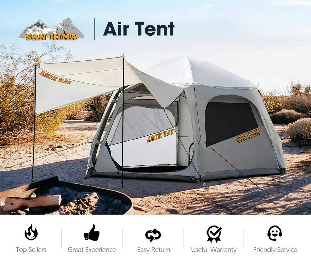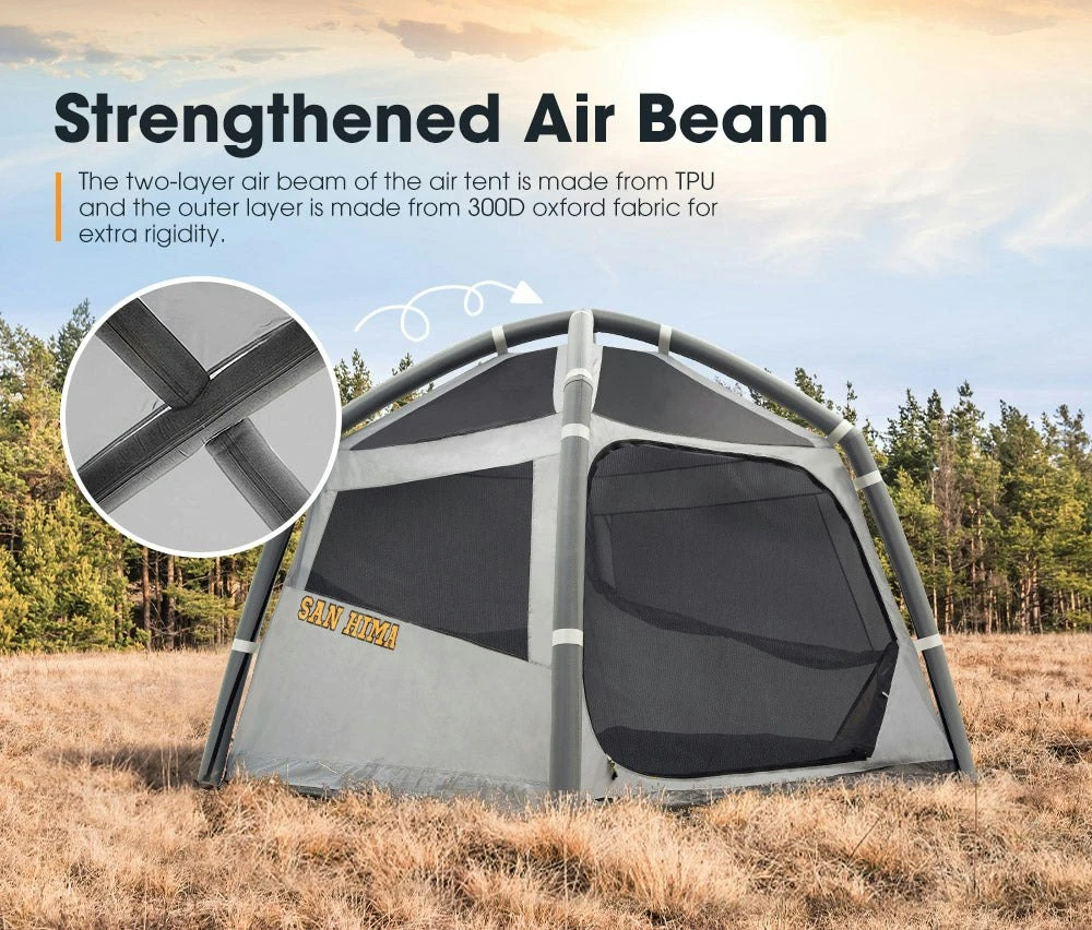DESCRIPTION Camping is one of the favourite activities among outdoor enthusiasts but there were days when they wished that setting up and folding a tent would be easier. Unlike regular tents, the San Hima inflatable tent/air tent has inflatable air beams, so just unfold the air tent, pump it up, peg it down and that’s it.