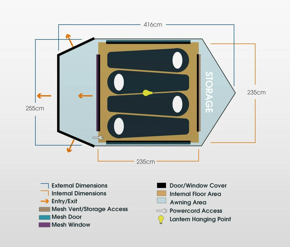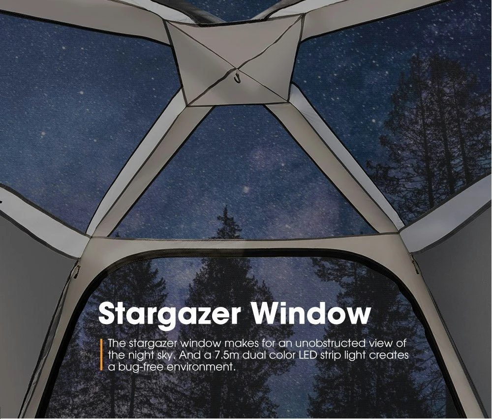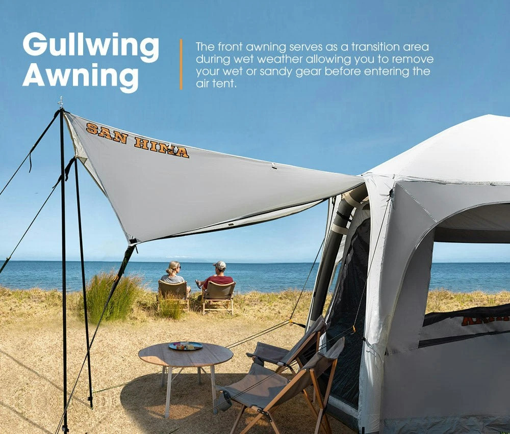 The San Hima air tent offers a large sleeping space. This means there’s plenty of room for 4 adults and that you’ll be able to walk around inside without hunching. 2 mesh windows can be opened up for ventilation while keeping insects out. For rougher weather, you will be well protected by the 210T “Mirror” fabric that reduces heat inside tent and 150D oxford fabric that features 3,000mm waterproof rating and a SGF 50+ UV protection. The stargazer window is the highlight of this air tent. Its location at the top makes for an unobstructed view of the night sky. The gullwing awning serves as a transition area that allows you to remove your wet gear before entering the air tent. FEATURES Speedy Setup: This air tent comes with a hurricane pump for speedy set-up (almost 25-30 times pumping), and a quick release air valve for faster deflating. Massive Space: This air tent/inflatable tent features a large space that can comfortably accommodate you and your other 3 companions without hunching. Twin-layer Exterior: The 210T “Mirror” fabric reduces heat inside tent and 150D oxford fabric boasts 3,000mm waterproof rating and a SGF 50+ UV protection. Light Blocking Tech: The “Mirror” fabric on the exterior of the air tent/inflatable tent aids sleep by blocking sunlight so you can sleep in past sunrise. Reinforced Interior: The interior of the air tent/inflatable tent is made of 190T+ reinforced Polyester mesh with PU coating for another layer of protection. Gullwing Awning: The front awning serves as a transition area during wet weather allowing you to remove your wet or sandy gear before entering the air tent. Strengthened Air Beam: The two-layer air beam of the air tent is made from TPU and the outer layer is made from 300D oxford fabric for extra rigidity. Stargazer Window: The stargazer window makes for an unobstructed view of the night sky. And a 7.5m dual color LED strip light creates a bug-free environment. Efficient Ventilation: The 4 facets of the tent come with meshes to keep bugs away, The front fly, the rear port and 2 side windows can be opened up for airflow. Durable PE Floor: Waterproofness, durability, longevity are all characteristics of the PE floor, strong enough to withstand harsh use. SPECIFICATIONS