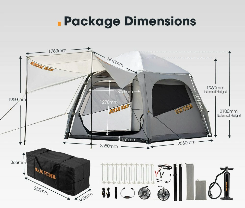 PACKAGE INCLUDES 1 x San Hima Air Tent 2 x Stainless Steel Poles 22 x Pegs 2 x Guy Ropes 1 x Pump 1 Kit Of LED Strip Light 12 x Velcro Tapes 1 x User Manual WARRANTY 2 Years Warranty
