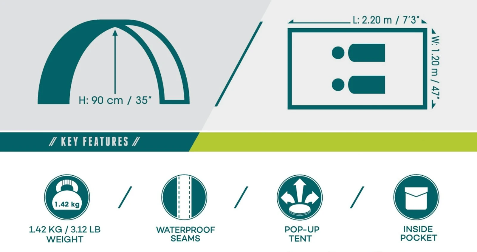 This simple are reliable tent will become an indispensible companion. Just the right size for 2 people, this tent can be set up under 5 minutes.