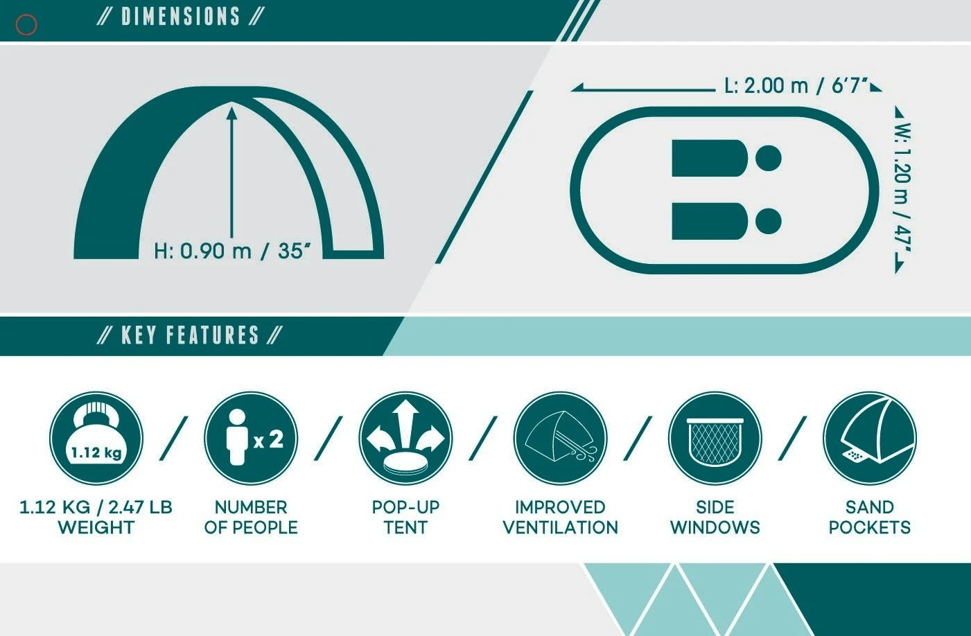 Have a safe, stable shelter instantly with this quick pop-up beach tent. Features include exceptional UV ray protection, lightweight and practicality. This tent is suitable for 2 people and is ideal for young families who need a quick set-up to enjoy more relaxation time.