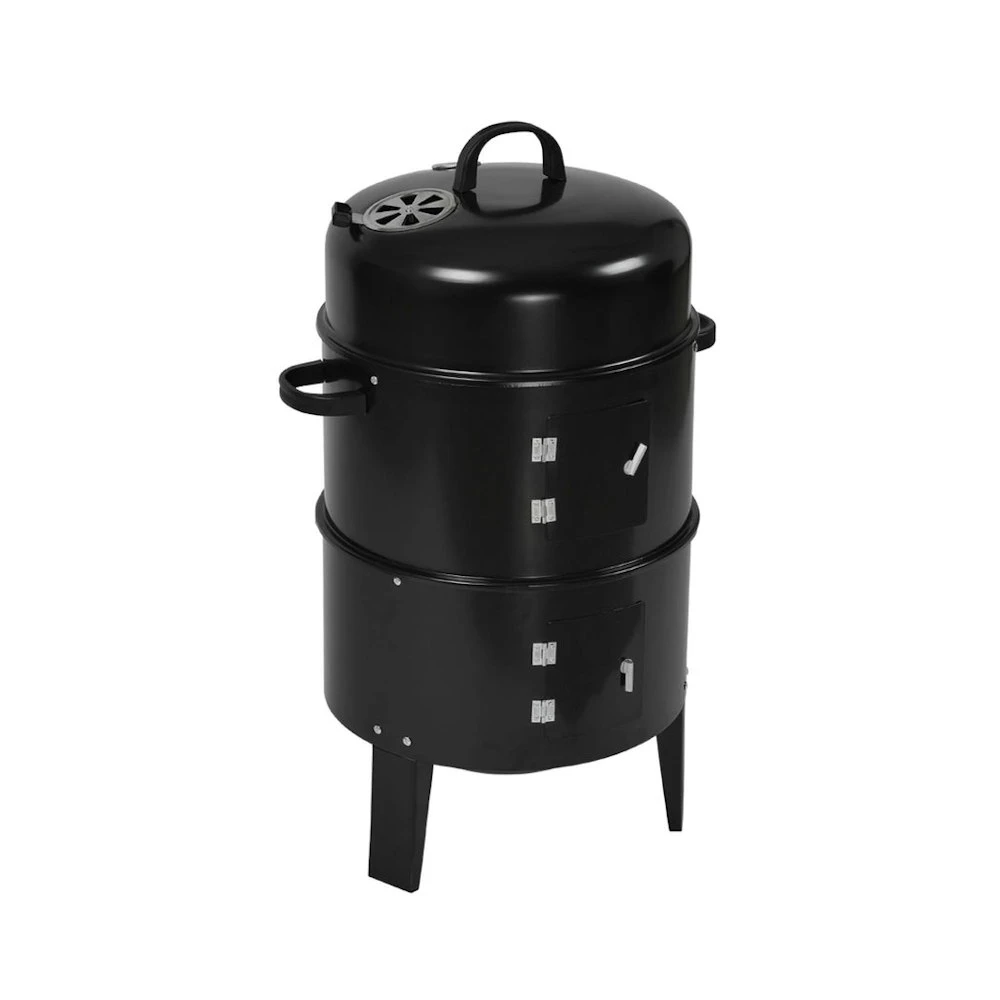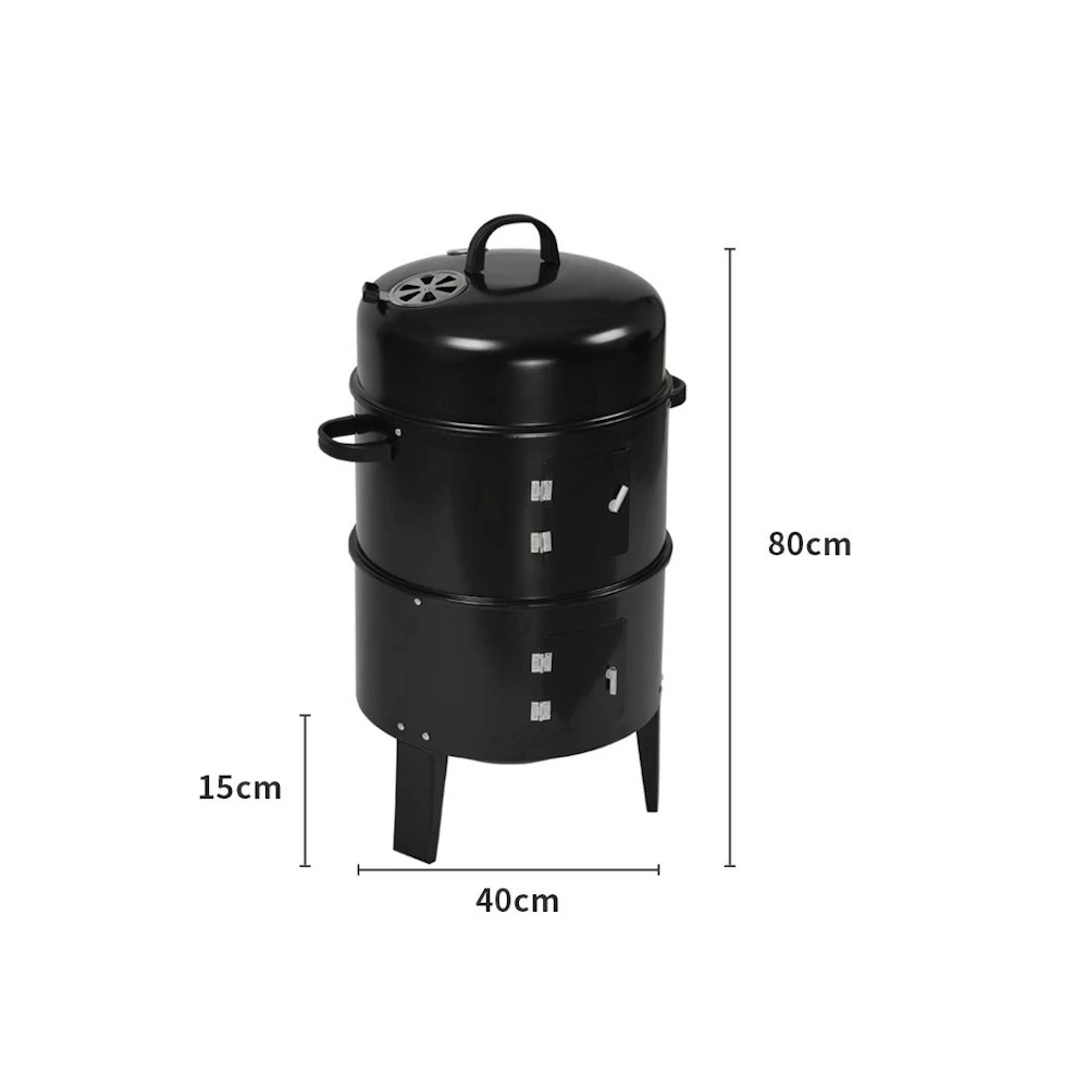Set up your BBQ smoker and load it up with charcoal. BBQ grill your meats to perfection. Impress your family with the selection of delicious meats and skewers. Nothing would top off a fishing adventure than your very own bullet smoker. Clean up your fish and smoking them to perfection. Adjust the air vent to get price temperature control. Put some water in the water pan and steam some vegetables dumplings or anything else you might want to steam. Use the side doors to check when they are ready. All handles are insulated. You can’t take it anywhere when it is hot. Let it cool down. Put it in the back of your car. Take it on an unforgettable camping trip. Pack plenty of charcoal and hunt or forage your own food. This will be with you for many years to come. You have two cooking spaces all made of steel. You can cook a lot of food at once or slow cook an entire roast. Key Features: 3-in-1 operation Grilling smoking and slow cooking Chrome plated grill rack Water pan Adjustable air vent Built-in thermometer Heat resistant handle Access door to check wood and water levels Detachable tier Bonus skewers and hooks SPECIFICATION: Material: Steel Skewers and hook material: Stainless steel Weight: 6.5kg Dimensions: 40cm x 40cm x 80cm (W x D x H) Colour: Black PACKAGE CONTENT: 1 x 3-in-1 BBQ Smoker 6 x Skewer 6 x Hook