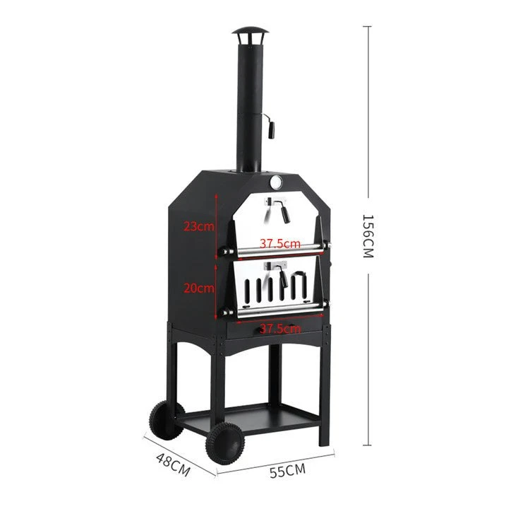 Set-up up your charcoal pizza oven. Put the pizza stone in. Watch as the temperature gauge rises. Bake your home-made pizza and delight in the crispy chewy texture of your very own creation. Put some charcoal and aromatic wood chips in. BBQ grill your meats to perfection. Impress your family with the selection of delicious meats and vegies. Nothing would top off your fishing adventure than your very own barbeque smoker. Clean up your fish and smoke them to perfection. Adjust the air vent to get the right temperature control. Move it undercover when you don’t need it. Roll it to the right spot when you want to cook up a storm. Store cooking tools underneath. You can empty out the ash tray easily after you are done. This will be with you for many years to come. You have one multi-purpose cooking space all made of steel. Use wood or charcoal. Cook a quick dinner or slow cook for an entire day. The choice is yours. Key Features: 3-in-1 design Charcoal fired pizza oven smoker and grill Premium steel rack Chimney Integrated thermometer Pull-out ash tray Lower storage shelf Heat resistant handles Air ventilation Durable wheels SPECIFICATION: Material: Steel Dimension: 55cm x 48cm x 156cm (W x D x H) Colour: Black PACKAGE CONTENT: 1 x Pizza Oven 1 x Stone Pizza Plate 1 x Instruction Manual