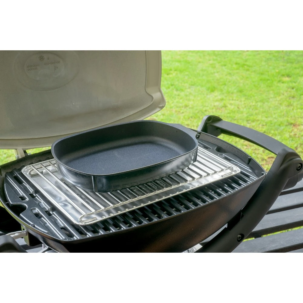 Now you really can cook everything outside on your Weber Q. The small frying pan allows you to cook omelettes, schnitzels, potato bakes, desserts and more! The Platinum Teflon coated surface is easy to clean and the detachable handle makes it easy to take the pan on and off your Weber Q.